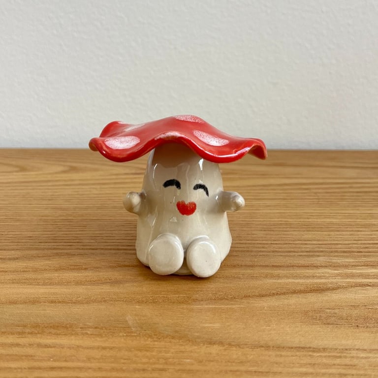 Et lille glad svampevæsen i keramik, der spreder smil hvor end det står. Figuren er håndlavet i stentøj og dekoreret med en rød hat med hvide prikker, en varm glasur og et charmerende ansigt.